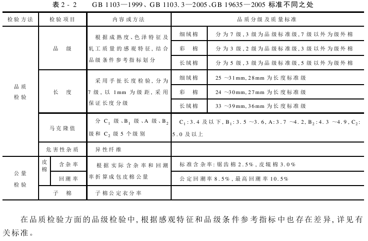 1.三個(gè)標(biāo)準(zhǔn)的共同點(diǎn) 從表2-1中可以了解到三個(gè)標(biāo)準(zhǔn)的共同之處。 (1)《棉花細(xì)絨棉》、《棉花天然彩色細(xì)絨棉》、《棉花長(zhǎng)絨棉》國(guó)家標(biāo)準(zhǔn)具有相同的術(shù)語(yǔ)和定義。 ①主體品級(jí):含有相鄰品級(jí)的一批棉花中,所占比例80%及以上的品級(jí)。 ②毛重:棉花及其包裝物重量之和。 ③凈重:毛重扣減包裝物重量后的重量。 ④準(zhǔn)重:凈重按棉花標(biāo)準(zhǔn)含雜率折算后的重量。 ⑤公定重量:準(zhǔn)重按棉花公定回潮率折算后的重量。 ⑥子棉準(zhǔn)重衣分率:從子棉上軋出的皮棉準(zhǔn)重占相應(yīng)子棉重量的百分率。 ⑦子棉公定衣分率:從子棉上軋出的皮棉公定重量占相應(yīng)子棉重量的百分率。 ⑧危害性雜物:混入棉花中的對(duì)棉花后整理、使用和棉花質(zhì)量有嚴(yán)峻影響的硬雜物和軟雜物,如金屬、磚石及化學(xué)纖維、絲、麻、毛發(fā)、塑料繩、布?jí)K等異性纖維或色纖維等。 (2)《棉花細(xì)絨棉》、《棉花天然彩色細(xì)絨棉》、《棉花長(zhǎng)絨棉》國(guó)家標(biāo)準(zhǔn)相同的檢驗(yàn)方法。 檢驗(yàn)方法均分為兩部分,即品質(zhì)檢驗(yàn)和公量檢驗(yàn)。品質(zhì)檢驗(yàn)內(nèi)容包含品級(jí)、長(zhǎng)度、馬克隆值、異性纖維和斷裂比強(qiáng)度檢驗(yàn)。公量檢驗(yàn)包含含雜率、回潮率、子棉公定衣分率檢驗(yàn)和成包皮棉公量檢驗(yàn)。因現(xiàn)行標(biāo)準(zhǔn)將含雜率和回潮率從量上體現(xiàn)出來(lái),將它們列入公量檢驗(yàn)部分。 (3)《棉花細(xì)絨棉》、《棉花天然彩色細(xì)絨棉》、《棉花長(zhǎng)絨棉》國(guó)家標(biāo)準(zhǔn)相同的檢驗(yàn)項(xiàng)目。 檢驗(yàn)項(xiàng)目中均分為子棉收購(gòu)檢驗(yàn)項(xiàng)目、檢驗(yàn)順序和成包皮棉檢驗(yàn)項(xiàng)目、檢驗(yàn)順序及成包皮棉組批規(guī)則,且檢驗(yàn)內(nèi)容基本相同。 ①子棉收購(gòu)檢驗(yàn)項(xiàng)目:子棉公定衣分率、子棉折合皮棉的公定重量、品級(jí)、長(zhǎng)度、馬克隆值、回潮率、含雜率、異性纖維。 ②子棉收購(gòu)檢驗(yàn)順序:子棉倒包檢驗(yàn)異性纖維、子棉重量、抽樣、試樣稱量、試軋及軋出皮棉稱量,從軋出皮棉中分別抽取樣品檢驗(yàn)回潮率、含雜率、馬克隆值,其余樣品供檢驗(yàn)品級(jí)、長(zhǎng)度。 ③成包皮棉檢驗(yàn)項(xiàng)目:品級(jí)、長(zhǎng)度、馬克隆值、異性纖維、回潮率、含雜率、公定重量。 ④成包皮棉批樣檢驗(yàn)順序:先從批樣中抽取樣品供含雜率檢驗(yàn),幸免雜質(zhì)失落,剩余樣品在檢驗(yàn)品級(jí)后再分別抽取樣品進(jìn)行長(zhǎng)度、馬克隆值和異性纖維檢驗(yàn)?;爻甭逝鷺庸┗爻甭蕶z驗(yàn)用。 ⑤成包皮棉組批規(guī)則:成包皮棉組批應(yīng)類型、主體品級(jí)、長(zhǎng)度級(jí)、主體馬克隆值級(jí)相同。 (《棉花細(xì)絨棉》標(biāo)準(zhǔn)中包含了軋工方式;《棉花天然彩色細(xì)絨棉》標(biāo)準(zhǔn)中包含了品種)。同一批棉花中,不同意有跨主體品級(jí)的棉花;和主體品級(jí)相鄰品級(jí)的棉花比例不得超過(guò)20%。不符合者應(yīng)挑包后后整理或協(xié)商處理。成批棉花可以分證,不宜合證;如零星棉包需要合證,其類型、主體品級(jí)、長(zhǎng)度級(jí)及馬克隆值級(jí)必須相同,回潮率相差不超過(guò)1%,含雜率相差不超過(guò)0.5%。 合證后的回潮率、含雜率值按加權(quán)平均計(jì)算。 2.三個(gè)標(biāo)準(zhǔn)的不同之處 (1)在《棉花天然彩色細(xì)絨棉》標(biāo)準(zhǔn)中,包含如下新的術(shù)語(yǔ)。 ①天然彩色細(xì)絨棉:棉纖維自身具有天然彩色的細(xì)絨棉,簡(jiǎn)稱“彩色細(xì)絨棉”。 ②彩色細(xì)絨棉色調(diào):色調(diào)是顏色的三屬性之一,用以表示紅、黃、綠、藍(lán)、紫等顏色的特征。 彩色細(xì)絨棉色調(diào)表示彩色細(xì)絨棉的顏色類型。 ③彩色細(xì)絨棉飽和度:飽和度是用以估價(jià)純彩色在整個(gè)視覺(jué)中的成分的視覺(jué)屬性。彩色細(xì)絨棉飽和度表示彩色細(xì)絨棉顏色濃淡的程度。 ④顏色特征:彩色細(xì)絨棉顏色純正、一致的程度。 (2)三個(gè)標(biāo)準(zhǔn)由于質(zhì)量要求的差異在檢驗(yàn)方法中存在差異,見(jiàn)表2-2。