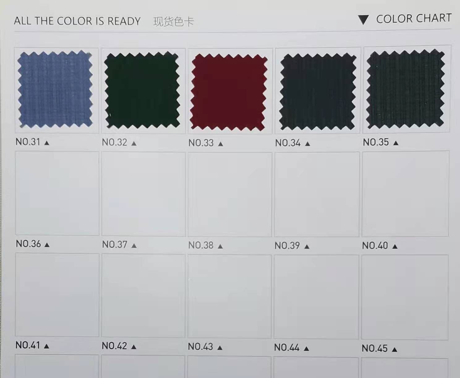 以上面料顏色均有現(xiàn)貨!無(wú)需定制定色,提供:品名,貨號(hào),色號(hào)即可以直接發(fā)貨!