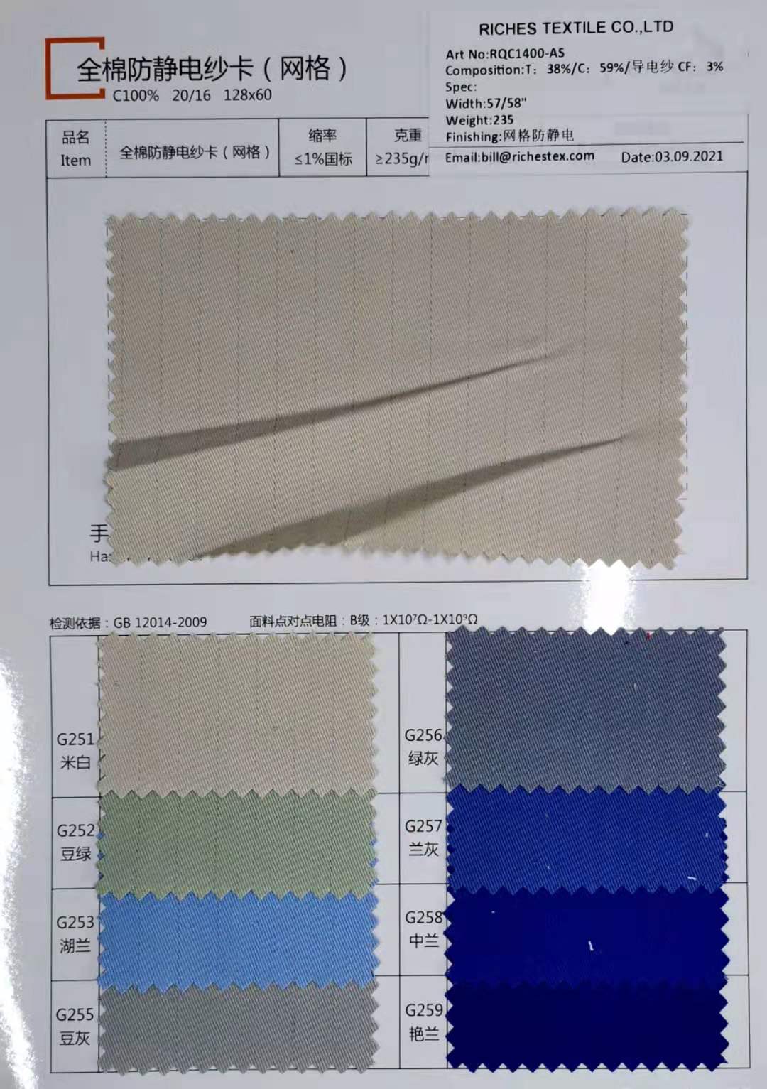 全棉防靜電紗卡面料(網(wǎng)格)38%T*59%C*3%導(dǎo)電紗 235克面料